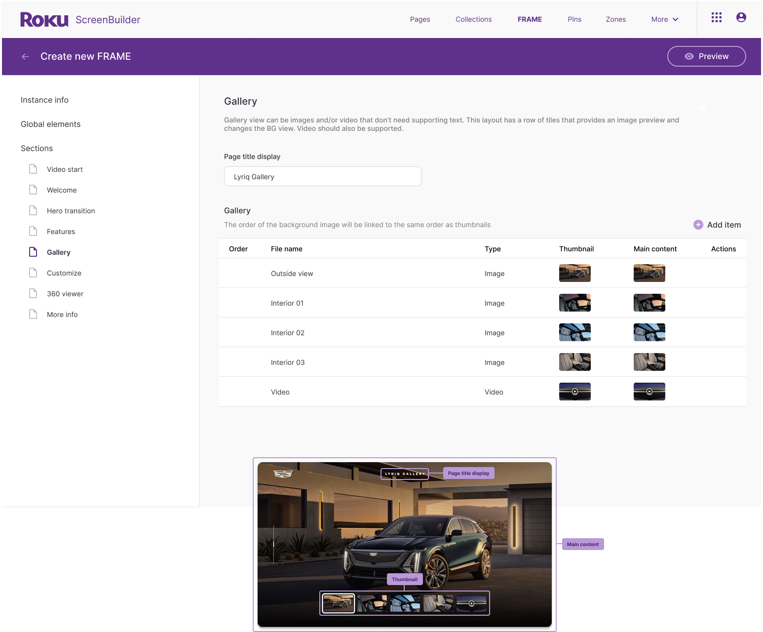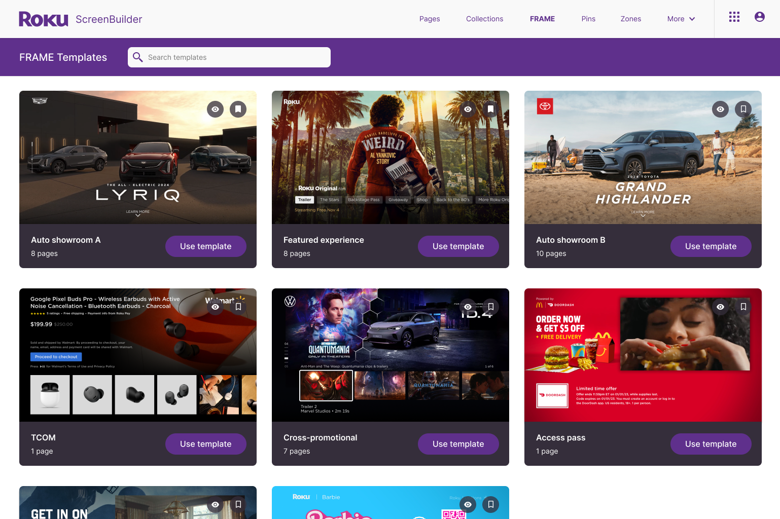 FRAME, which stands for Flexible Roku Ad Microsite Experience, is a new system that houses and manages flexible microsite templates which can be leveraged by users of ScreenBuilder, so that they can easily curate microsites across the Roku Platform.